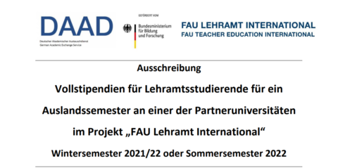 Das Projekt „FAU Lehramt International“ und die Stipendien werden durch den Deutschen Akademischen Austauschdienst (DAAD) aus Mitteln des Bundesministeriums für Bildung und Forschung (BMBF) gefördert.